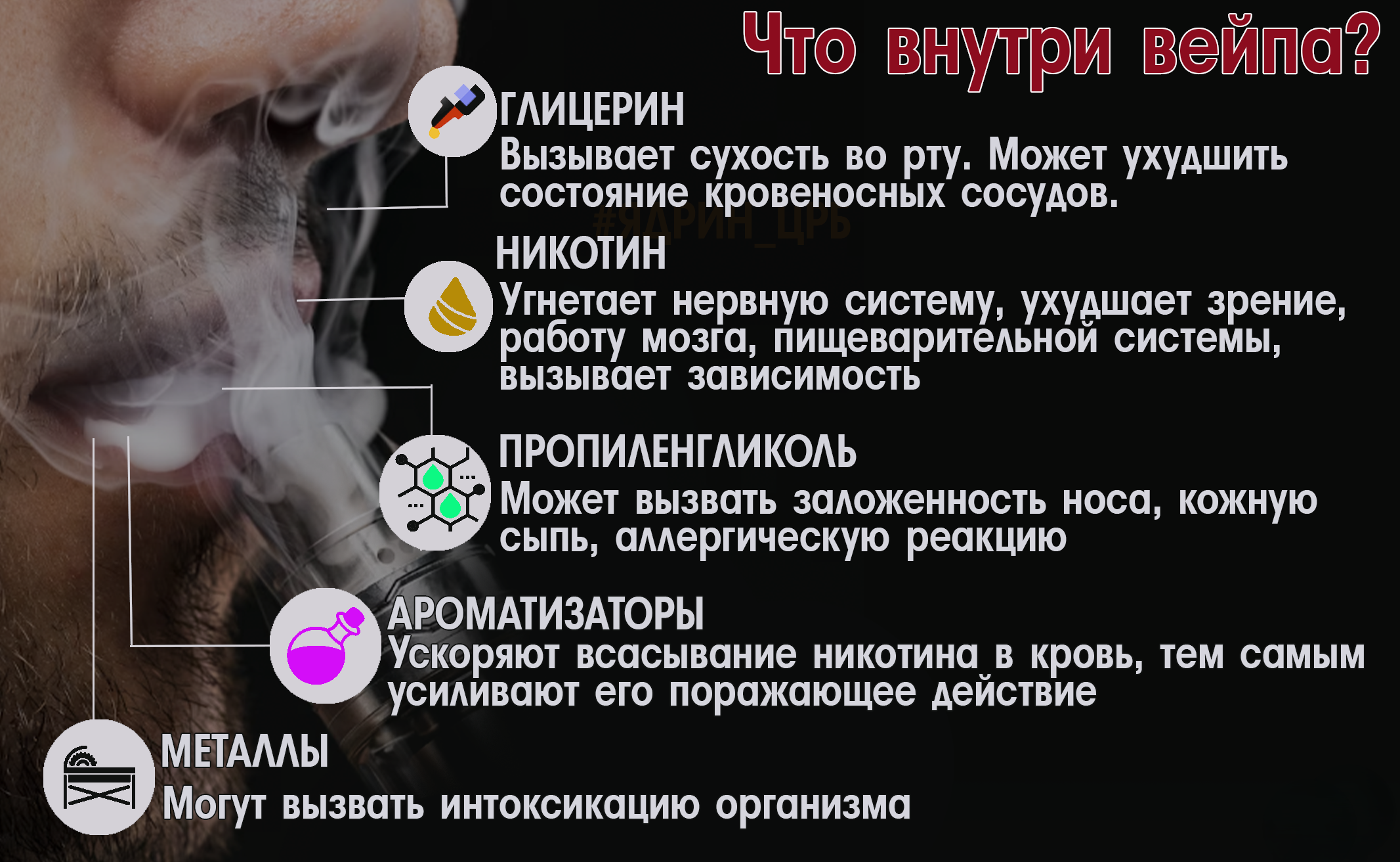 При курении электронных сигарет или вейпов в выделяющемся паре содержится более 30 видов опасных веществ. Например, пропиленгликоль способен накапливаться в организме, вызывая аллергические реакции, нагноительные процессы, вызвать нарушение работы печени и почек. При термическом разложении пропиленгликоля и глицерина повреждаются органы дыхания, центральная нервная система, развиваются мутагенные процессы.